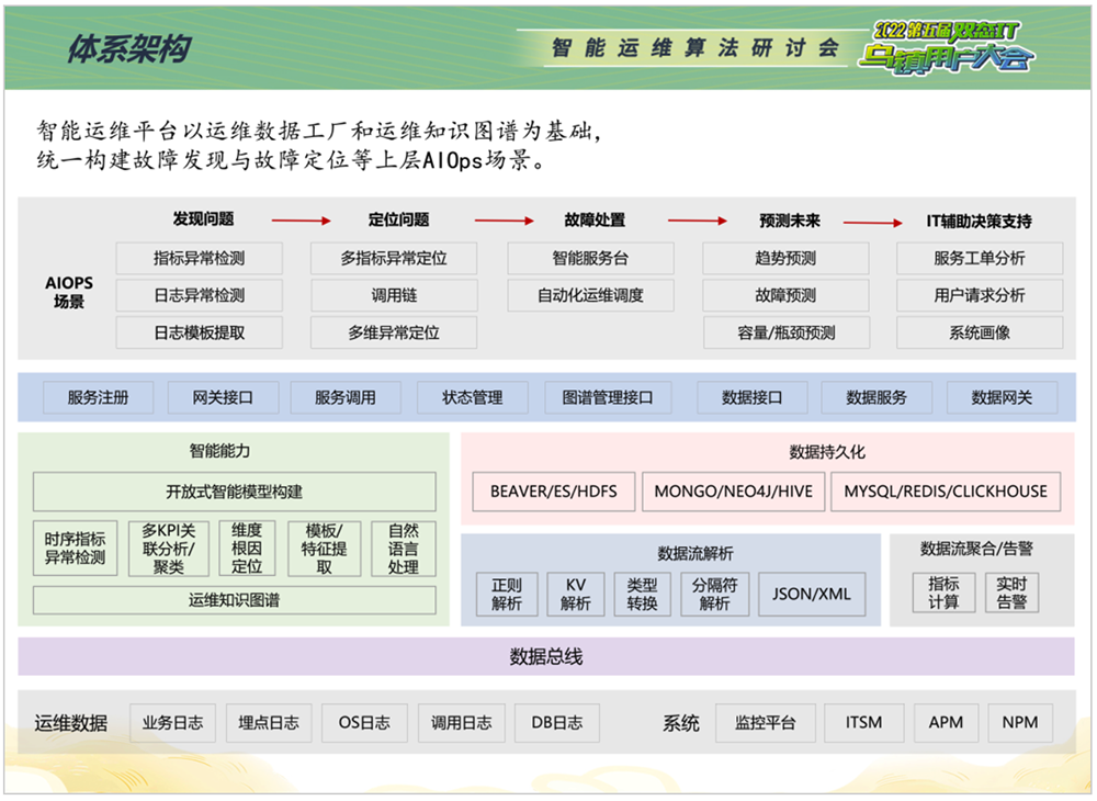 整个平台采用开放式架构,综合智能算法、微服务、数据总线,实现服务接口和各类数据的模块化组织,快速迭代去建设新的运维场景。