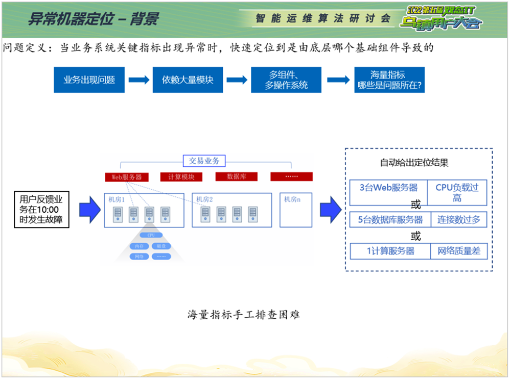 机器指标定位。很多业务性能指标的变化是由机器异常引起的,或者说机器指标也有直接体现。比如某个分布式应用的业务指标响应时间变长,通常会查看相关模块指标是否有异常。但是机器指标繁多,操作系统有CPU、网络等20多个指标,网交系统有几百个机器、几千个指标,如何从中快速定位异常机器?相比于传统阈值、人工查看历史数据的方式,AIOps能够在业务系统关键指标出现异常时,快速定位到是由底层哪个基础组件导致的,大幅缩减工作量。
