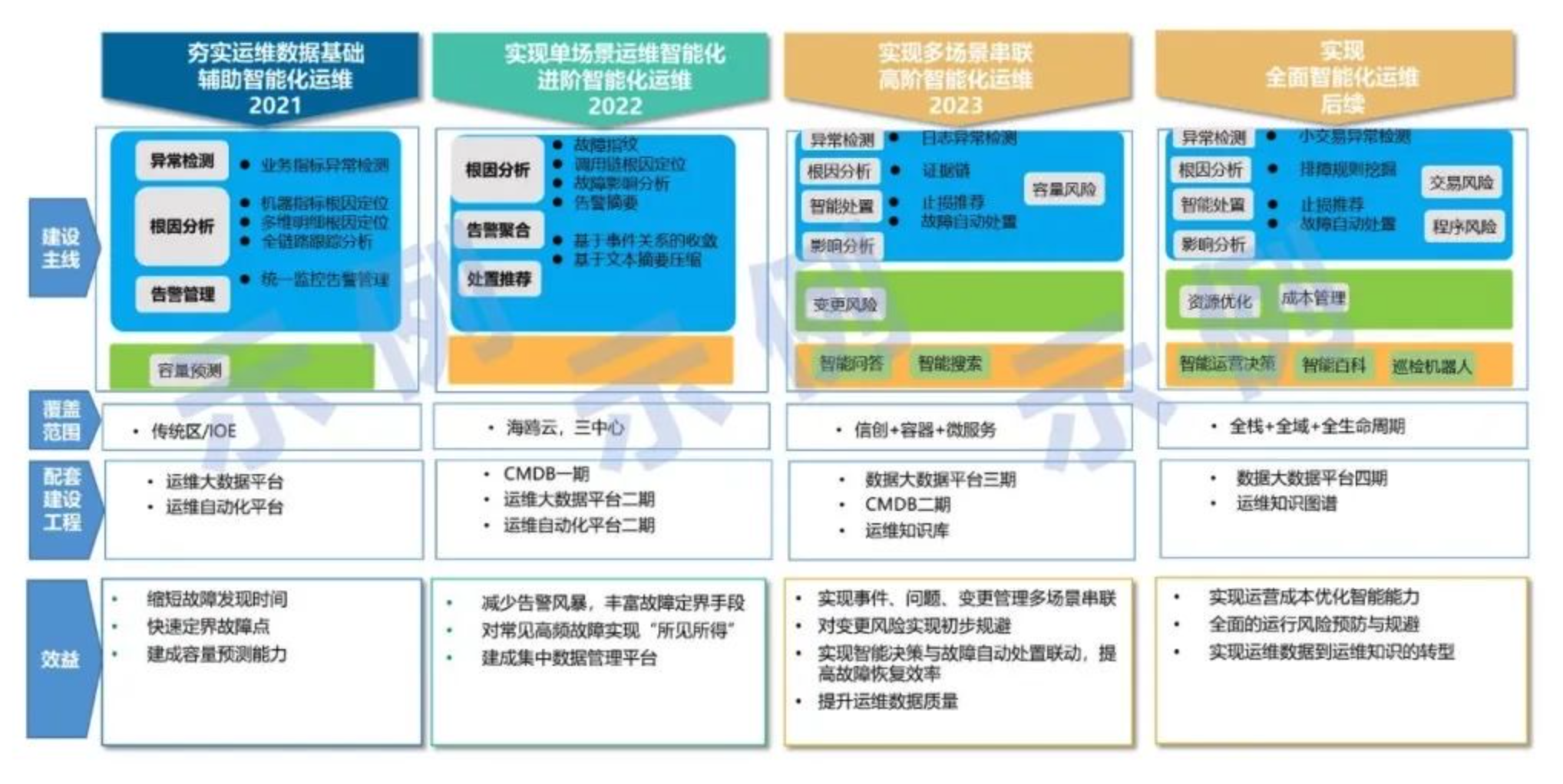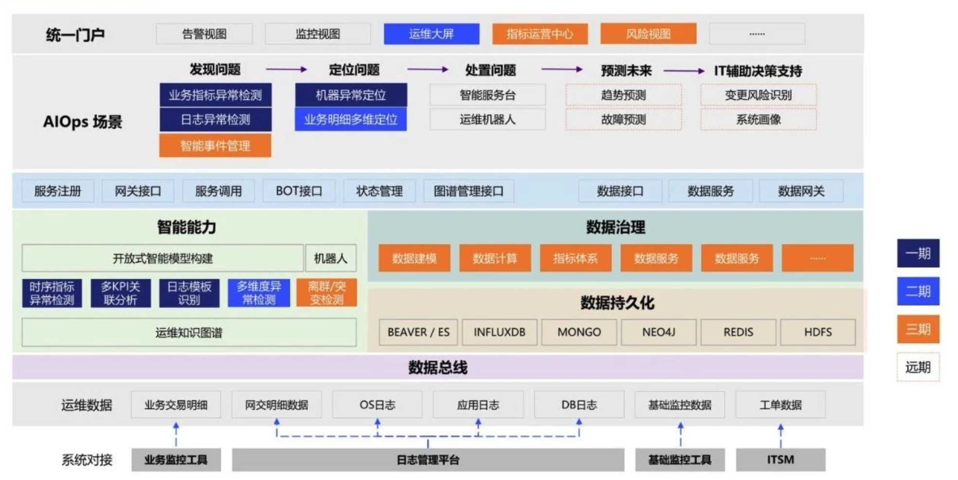 在项目建设之初,该银行将智能运维系统效果的目标设定为“十分钟定位问题、十分钟恢复服务”。而与之对应现实的状况是:故障发现依赖于业务部门报障或者银行储户报障、运维数据质量参差不齐、排账依赖专家经验、故障定位基本靠人肉...面对目标与现实状况差距较大的状况,他们并没有追求一步到位,而是分解成多期建设小目标,从2019年到2022年,目前以建设四期,每期都有科学合理可量化的目标。