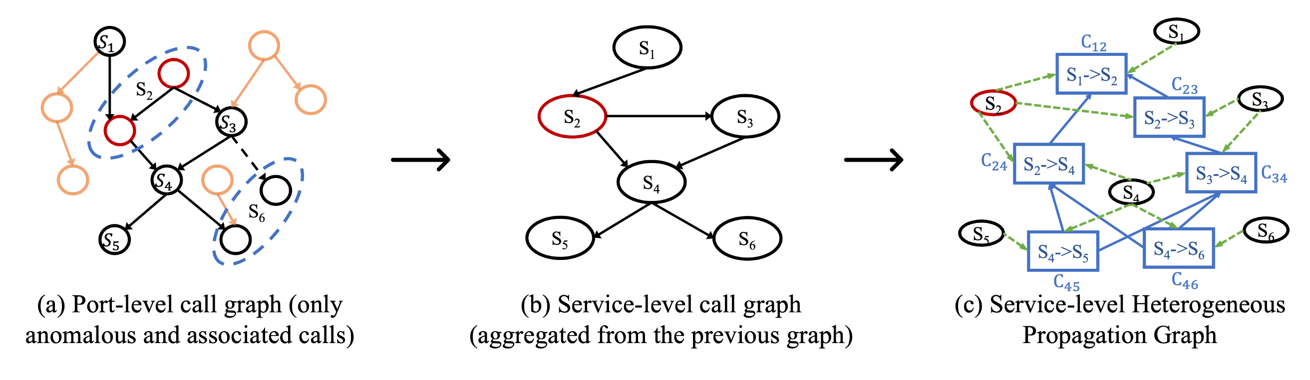 异构传播图构建阶段:MicroDig以微服务之间的调用和候选微服务作为节点,构建异构传播图。在关联调用识别阶段构建的关联图是有向的,其边的方向表示服务之间的调用关系。关联图不能直接用作根因定位的因果图。文章基于关联图构建了一个反映调用和服务之间因果关系的异构传播图。如图3(c)所示,文章首先将关联图中的边(即边S1→S2、边S2→S3等)抽象为调用节点(表示为C12、C23等),并将关联图中的节点抽象为服务节点(表示为S1、S2等)。然后,文章在因果图中添加调用节点与服务节点之间的边和两个不同调用节点之间的边。最后,构建具有不同类型节点和边的异构传播图,在传播图中,边是从原因指向结果。为了执行根因定位,文章翻转传播图中的每条边,并使边从结果指向原因。