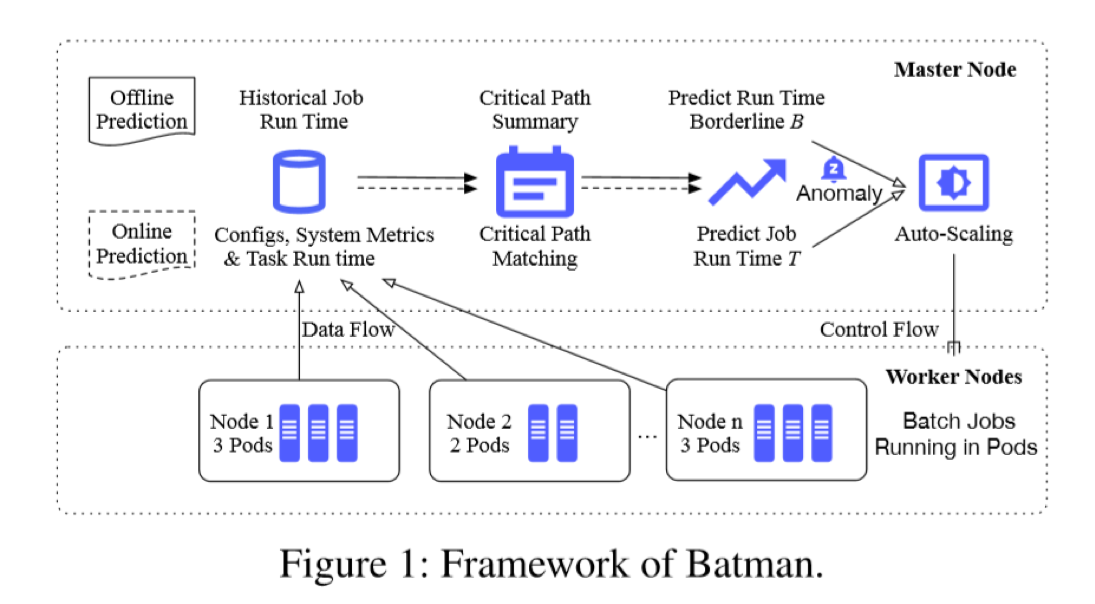 本文设计的Batman框架可以精确预测批处理任务的运行时间并且自动调整云分配的资源。首先,为了精确预测运行时间上下基带,本文定义了关键路径的模式:关键路径是一系列子任务,对于批处理作业的每次运行,这些子任务的运行时间之和在所有工期中最长。接着,我们使用了一个CNN-LSTM模型来预测在线批处理任务的运行时间,模型的输入是从批处理任务运行环境中收集到的系统指标(CPU利用率,内存使用率等等)。最后,如果在线预测的时间比上下基带要大,一个自动扩缩容策略会用最少的资源加速任务在规定的时间内完成。