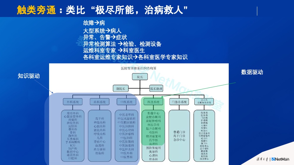 在此我简单分享下运维与医学的类比,希望在思考方式方面给大家一些启发。我们可以把负责排障的数据中心组织及员工类比为医院及员工,故障类比为疾病,数据中心软硬件系统类比为病人,异常和告警类比为症状,异常检测算法类比为检验、检测设备,运维科室专家类比为医院科室医生,各科室运维专家知识类比为各科室医学专家知识。简单疾病(故障)单独科室就能处理了,复杂病症(故障)需要关联各种数据,并且跨科室专家会诊。