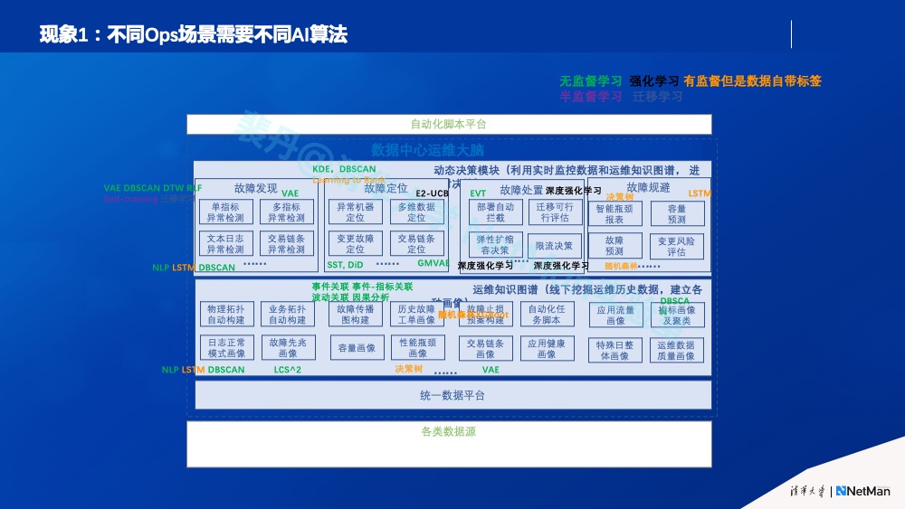 首先,相信大家到现在已经都了解不同运维场景用的技术和算法是不一样的(如下图所示我在清华实验室发表的论文中采用过的基础算法),很难用黑盒方法来做。